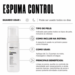 👉 A Espuma Facial Control Skin (Simple Organic) é perfeita para isso, pois limpa profundamente, controla o excesso de sebo e mantém o equilíbrio natural da pele. A textura leve garante frescor sem repuxar, preparando o rosto para os próximos cuidados.